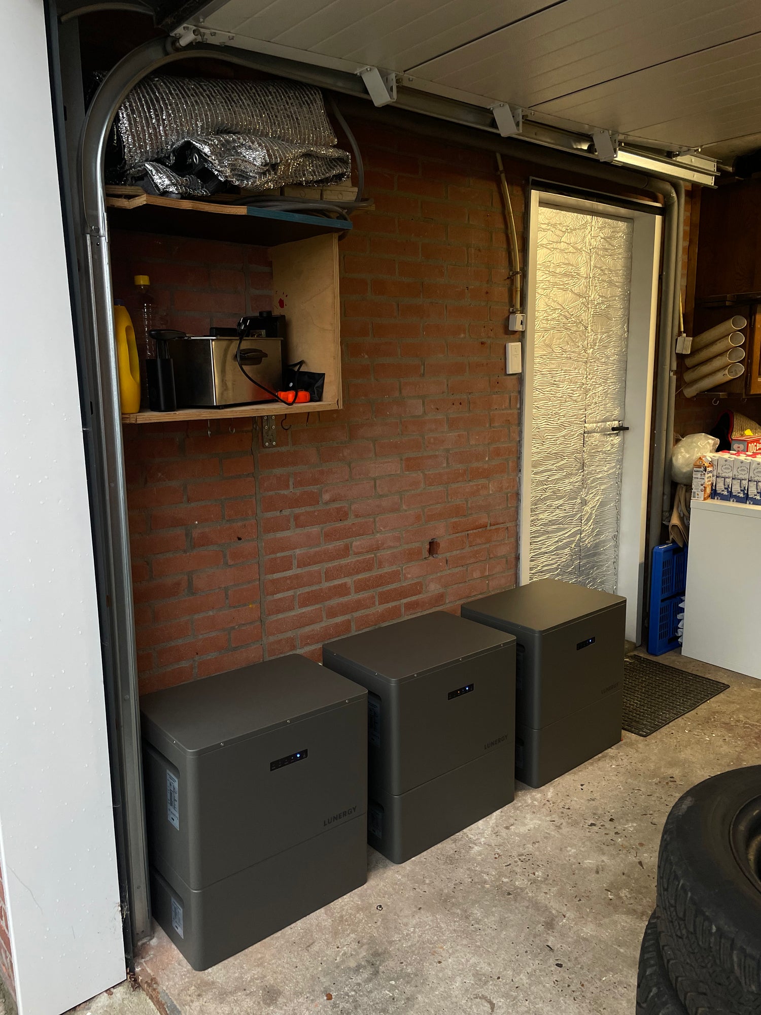 “Een vriend heeft me geholpen om in mijn garage drie aparte groepen aan te leggen, elk aangesloten op een aparte fase van mijn driefasige huis. Zo kan ik mijn Lunergy gewoon in elk stopcontact steken en 2400 W per fase terugleveren, in totaal 7200 W en 15 kWh. Hierdoor hoef ik ’s nachts vrijwel geen stroom van het net te gebruiken.”