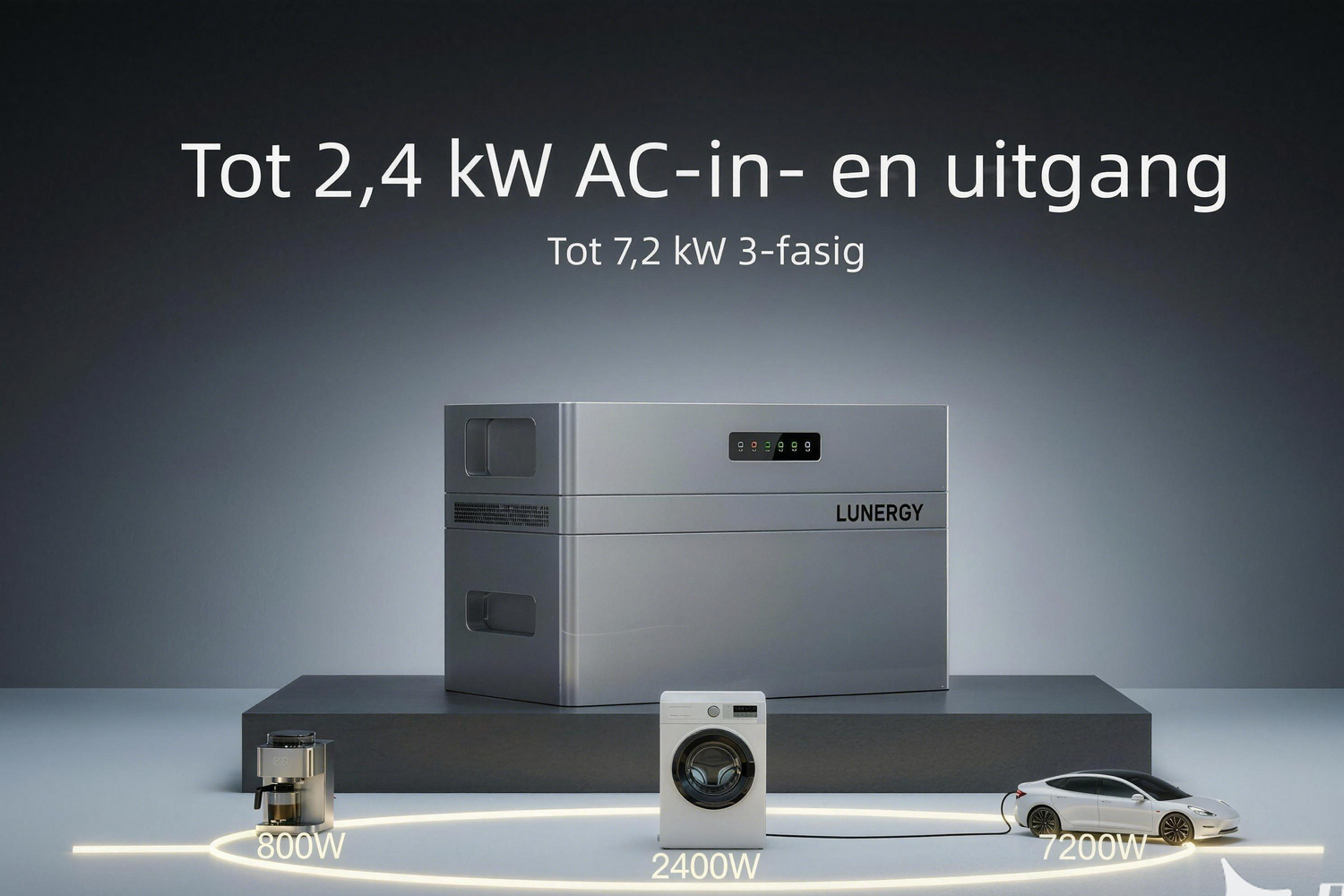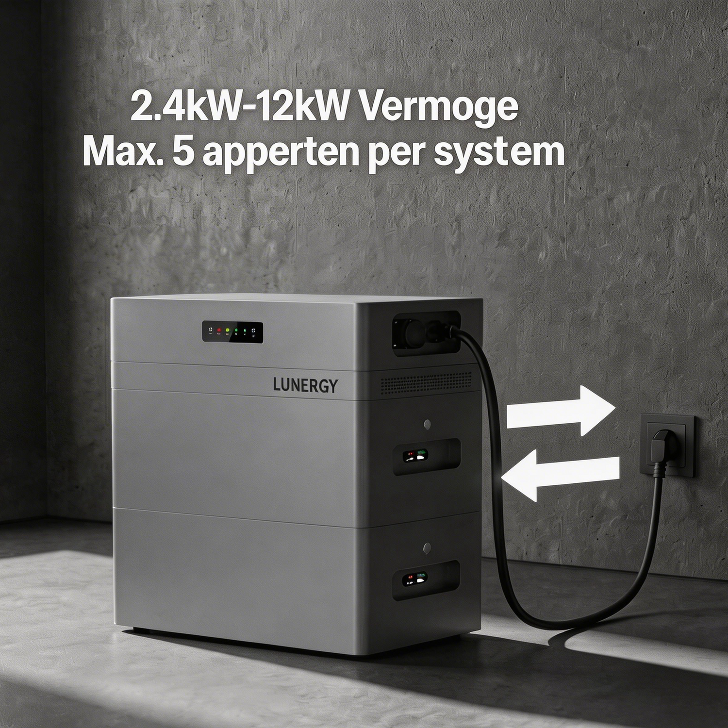 Met de Lunergy-batterij sla ik overdag zonne-energie op en gebruik ik die ’s avonds — simpel en voordelig. De Lunergy Hub 2400 AC ondersteunt ook tot 2400 W off-grid, zodat ik stroom heb wanneer het net uitvalt."